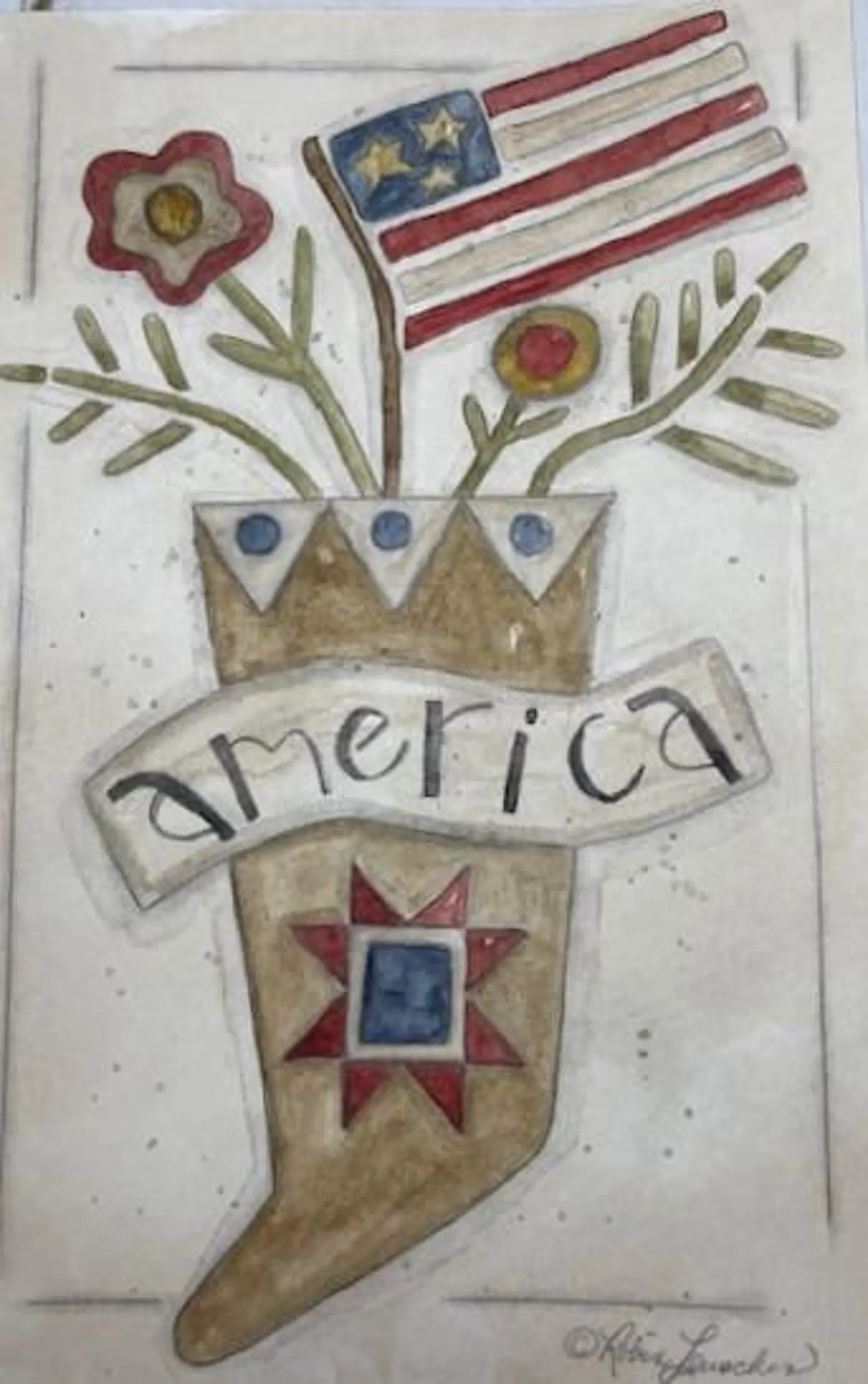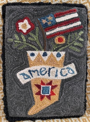 America Stocking is one of three “stocking” pattern designs by Robin. For a classic look, hook your stocking with a gold texture. Red, white, and blue rule the rest of the color plan! Hurray!