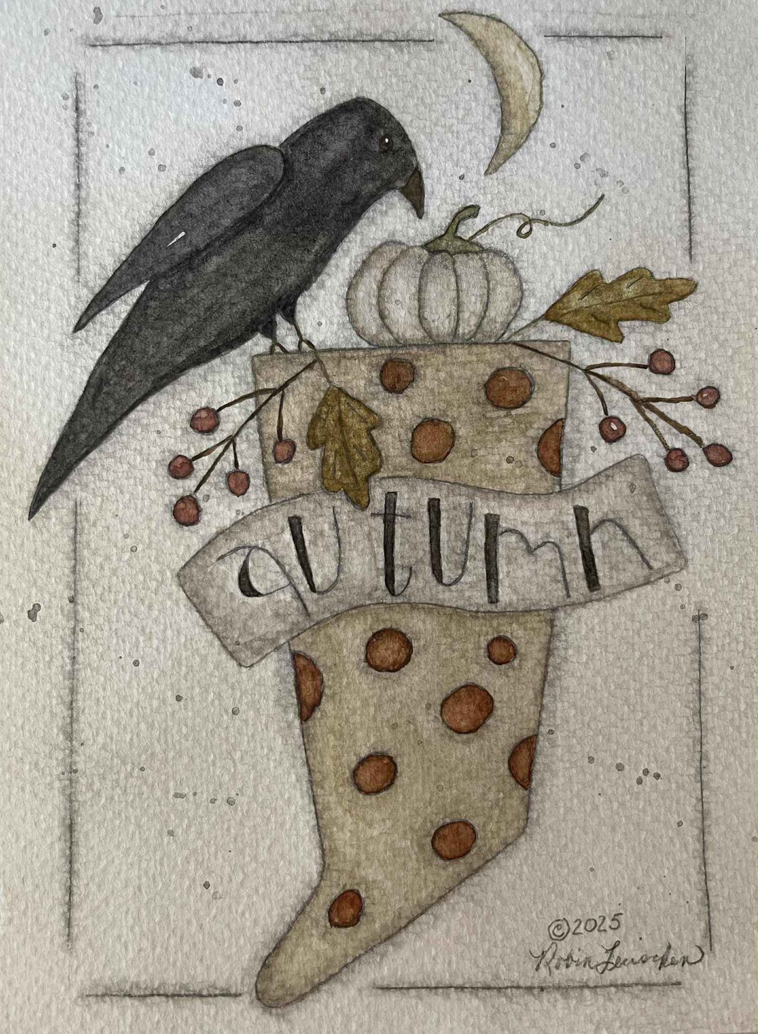 Autumn Stocking is one in a series of three “stocking” designs. Perfect for fall decorating! Hook your crow in deep dark blue or antique black for a prim look.