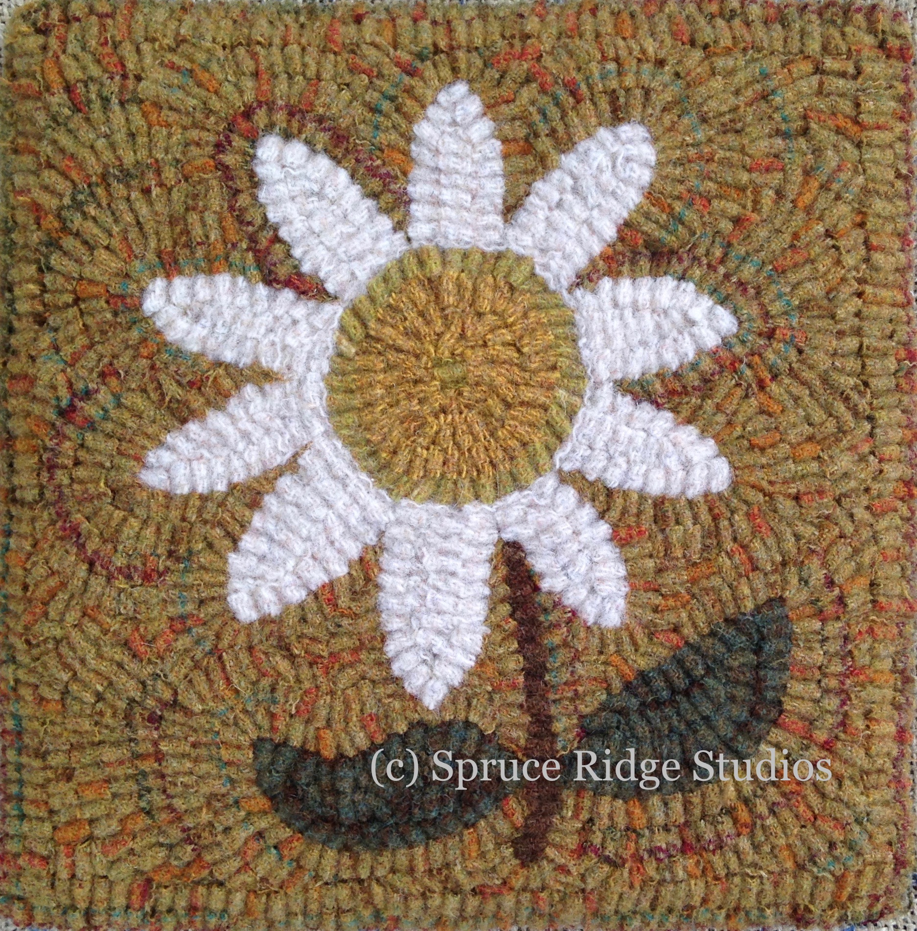 The Garden Daisy kit is perfect for beginners. The kit contains a pattern on your choice of linen or monks cloth, a basic rug hook, wool cut into #8 strips (1/4 inch), and easy to follow instructions, telling you where to hook the colors