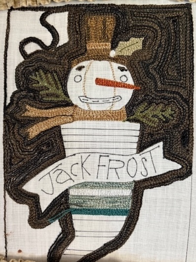 Jack Frost is one in a series of three “stocking” designs by Robin. He is quite the charming snow guy with his warm wooly scarf, jaunty top hat, and sly grin. Hook his face in creamy white textures and don’t forget that pop of orange for a carrot nose!