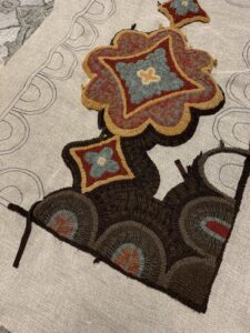 I recently started hooking the large tabs around the sides of my Parlor Rug. At first I thought the soft plaid that I used in the center medallion would be a nice fill for the center of the tabs, carrying that color out to the edges. However, I cannot emphasize enough that when you are working on a large rug, one needs to get it off the frame, lay it on the floor, and take a good look at the hooking. What I thought was a good idea was more of a failure. I felt that the soft plaid was too soft and didn’t create a place for my eye to rest, to say “stop, this is the end.” It seemed like the border of the rug just faded away into nothingness. What to do?